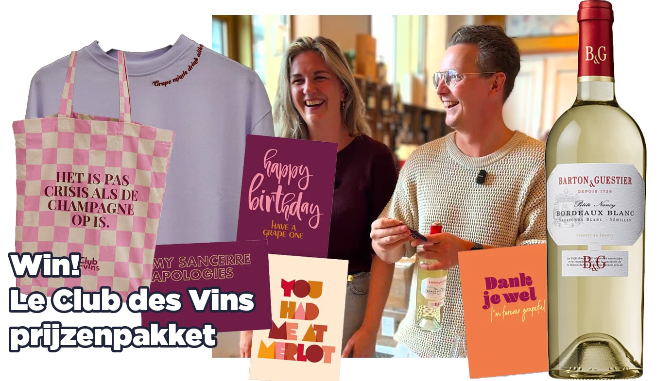 Beantwoord de prijsvraag en wie weet ontvang jij dit fantastische Le Club des Vins prijzenpakket met een 'Het is pas crisis als de Champagne op is'-tas, een 'Grape minds think alike'-t-shirt en een supergrappig kaartenpakket! (Het juiste antwoord vind je ook achterop iedere B&G fles verkrijgbaar bij Jumbo).