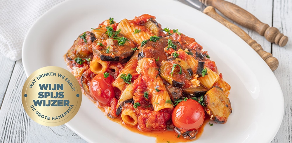 Bij Pasta alla Norma, passen wijnen zoals rode wijn nero d’avola.