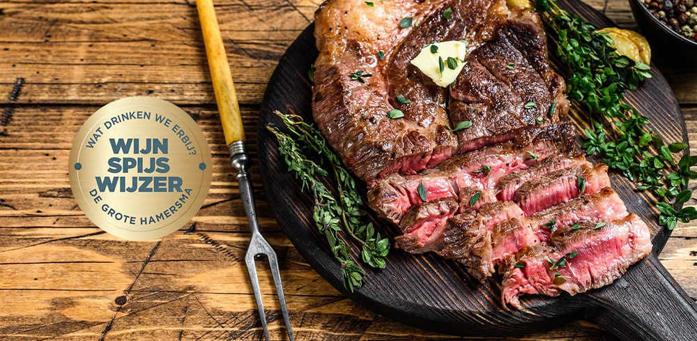 Wat drink je bij een ribeye? Je mooiste rode. Onze wijnspijswijzer noemt Cabernet Sauvignon en Syrah, maar dat mag je breed opvatten. Médoc heeft veel CB aan boord bijvoorbeeld, en de grootse wijnen van Cornas en de Hermitage, het noordelijke Rhônegebied, zijn van de syrahdruif. Ribeye heeft immers de ideale eiwitten en vetdooradering om tannines smeltend te laten smaken, dus kom maar door met de rode wijn. Barolo? Ja hoor. Brunello? Zeker. Maar ook een betaalbare Australische Shiraz of Cabernet zet in deze carnivore situatie zijn beste beentje voor.